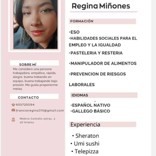 Soy trabajadora, espontánea con don de gentes,me gusta trabajar en equipo y siempre tengo ganas de aprender Curso de atención al cliente Manejo de traspale Experiencia en fábricas ,textil,automoción, sala blanca,cartonaje,flejado