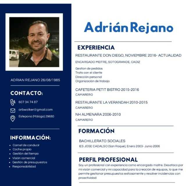Soy un chico de 39 años con experiencia, serio y responsable. Buen manejo de bandeja y profesional