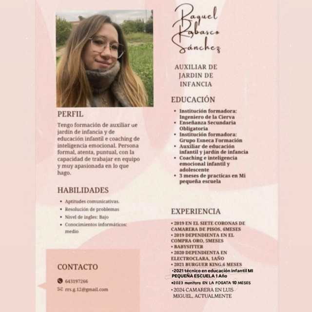 Soy una persona proactiva, responsable, simpática, perfeccionista, con facilidad para aprender y adaptarme. Dispongo de coche y carnet de conducir tipo B.