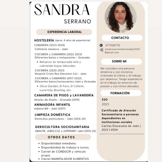 Soy una persona con muchas ganas de aprender, simpática y capaz de simultanear varias tareas a la vez. Soy una gran amante del café.