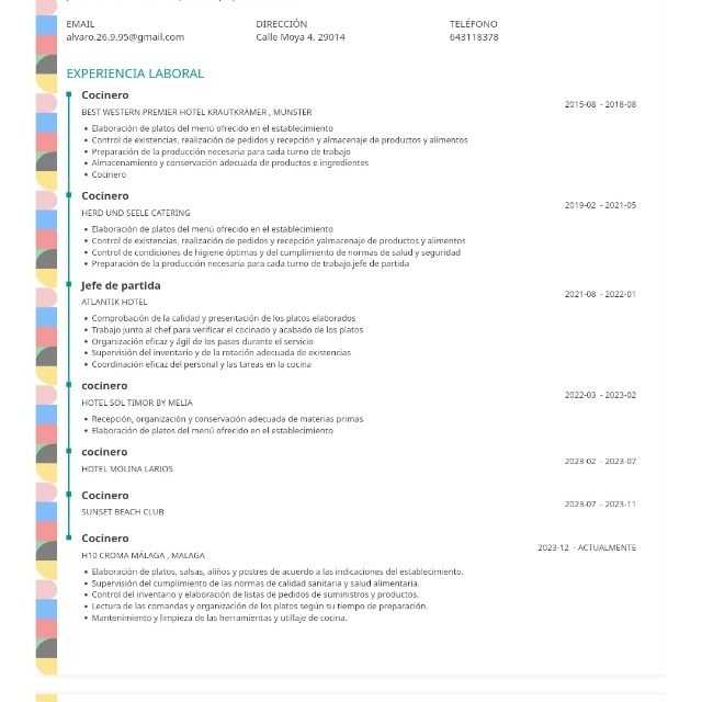 Cocinero creativo e innovador, hábil para renovar menús y reinventar preparaciones clásicas. Busco un puesto donde desarrollar mis habilidades y contribuir al éxito del negocio.