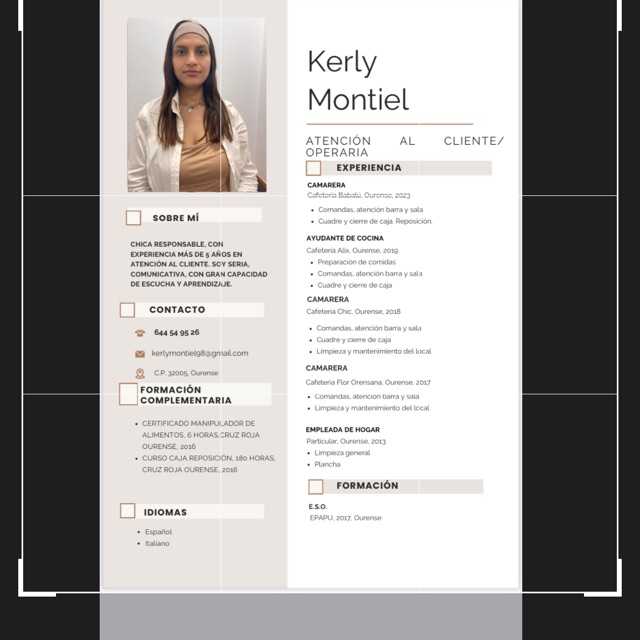 Camarera con más de 10 años de experiencia en el área de servicio al cliente, conocimientos culinarios, facilidad de atención en bares y salas, y habilidad en la limpieza.