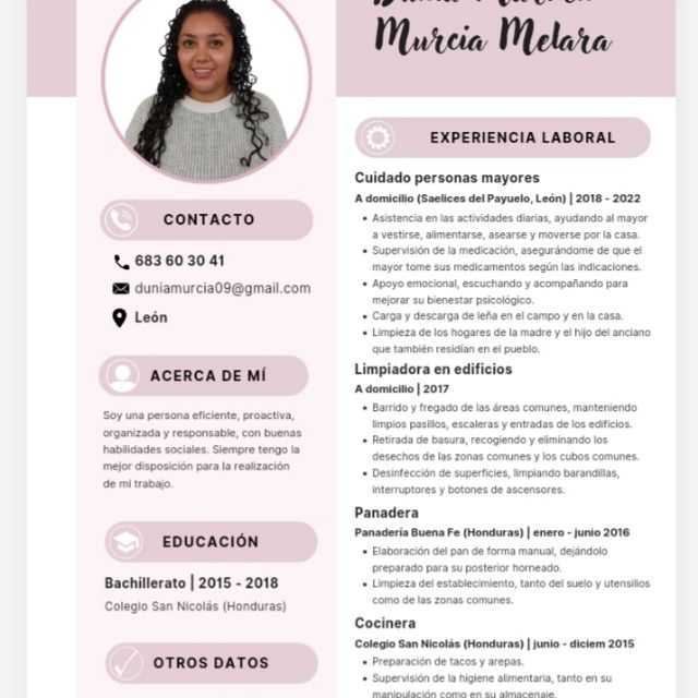 He trabajado en diferentes sectores por lo que soy una persona polivalente. Soy muy alegre y genero buen ambiente de trabajo en equipo. En busca de una oportunidad laboral.
