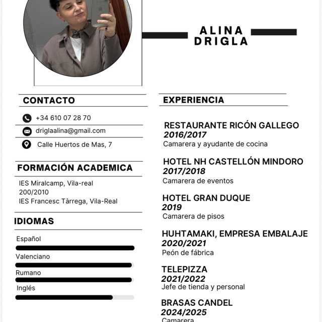 Profesional polivalente con experiencia en educación, atención al cliente, servicios técnicos y hostelería. Me caracterizo por la responsabilidad, rapidez de aprendizaje y capacidad de adaptación a distintos entornos laborales.