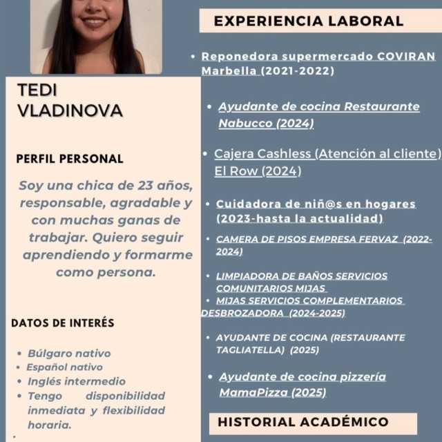 Experiencia en hostelería como camarera y limpiadora con habilidades en informática.