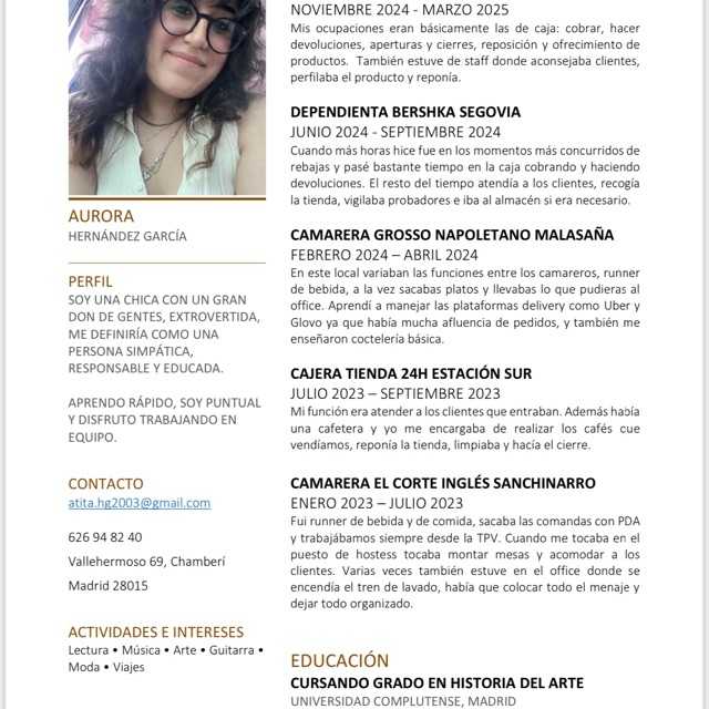 Persona con ganas de aprender, con mucho entusiasmo y responsable. Experiencia en atención al cliente y gestión de tiendas.