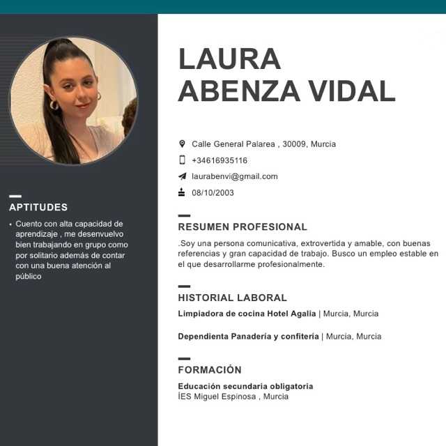 Persona comunicativa, amable y capaz de adaptarse a cada situación. Busco una oportunidad laboral donde demostrar mi compromiso y capacidad de trabajo.
