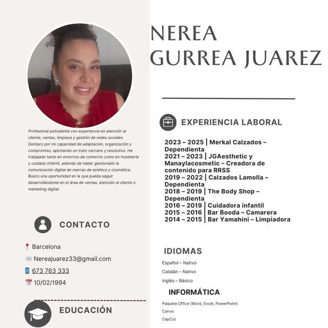 Profesional polivalente con experiencia en atención al cliente, ventas, limpieza y gestión de redes sociales. Destaco por mi capacidad de adaptación, organización y compromiso.