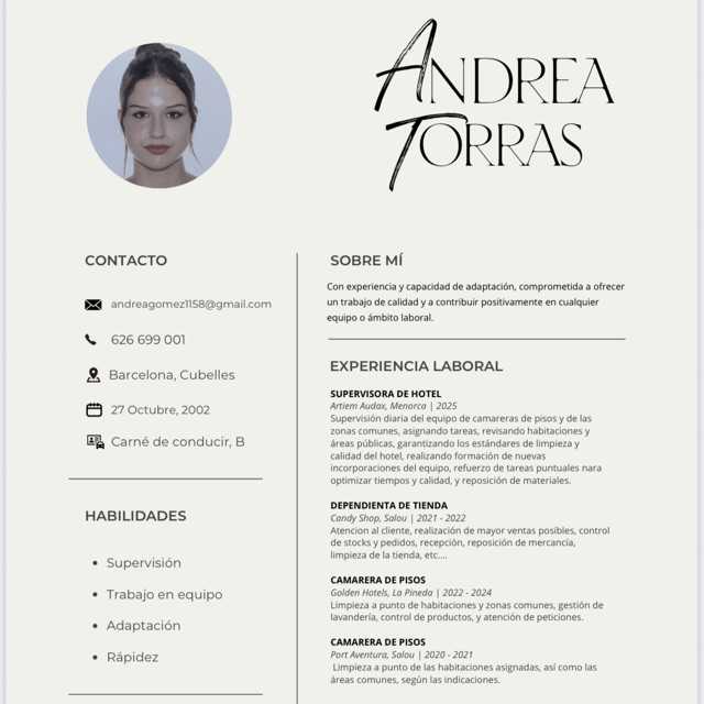 Con experiencia y capacidad de adaptación, comprometida a ofrecer un trabajo de calidad y a contribuir positivamente en cualquier equipo o ámbito laboral.