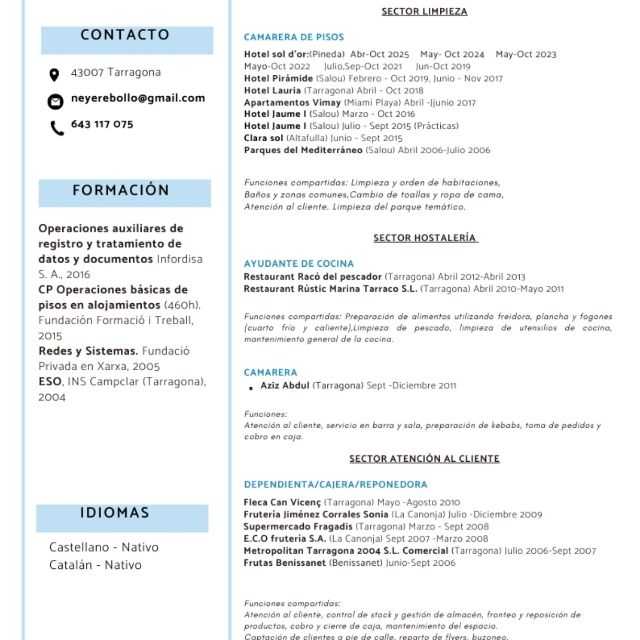 Dinámica, resolutiva. Perfil polivalente, me considero una persona activa, valoro el compañerismo y el buen ambiente de trabajo. Hotel sol d'or camarera de pisos 20/04/2025 a 21/10/2025