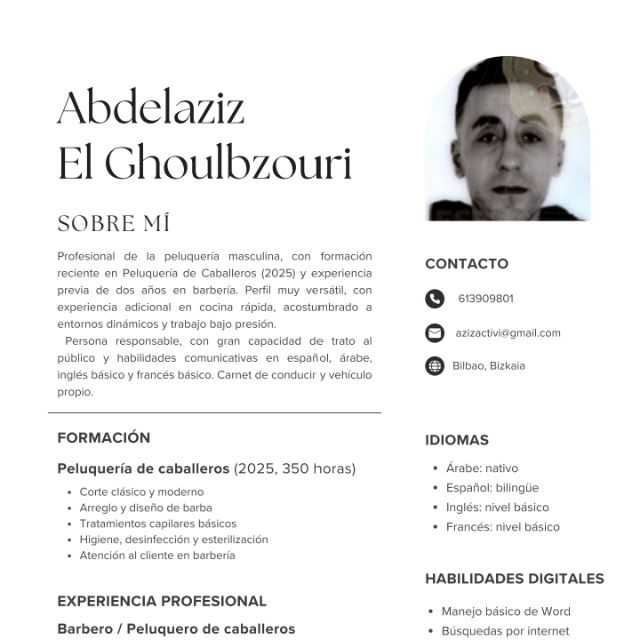 Profesional de la peluquería masculina con experiencia en barbería y cocina rápida, acostumbrado a entornos dinámicos.
