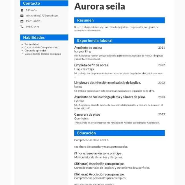 Soy una empleada eficaz, puntual y sobre todo dedicada con su trabajo. Siempre dispuesta a ampliar mis conocimientos en cocina y practicar en nuevas áreas
