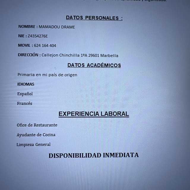 Amplia disposición para el trabajo en equipo así como facilidad para aprender, respetuoso y paciente, con disponibilidad total. Capacidad para resolver problemas mediante el dialogo. Carnet de manipulador de alimentos
