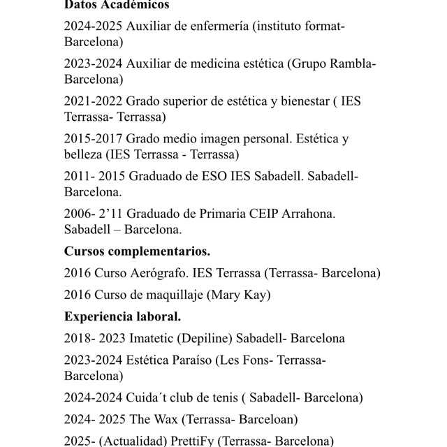 Hola, me llamo Claudia, y me encanta el mundo de la belleza, me e formado tanto en estetica en (Cazcarra), como en maquillaje en (Stick Art y Thuya) Me gusta hacer realidad la visión de las clientas, tanto en estetica como en maquillaje.