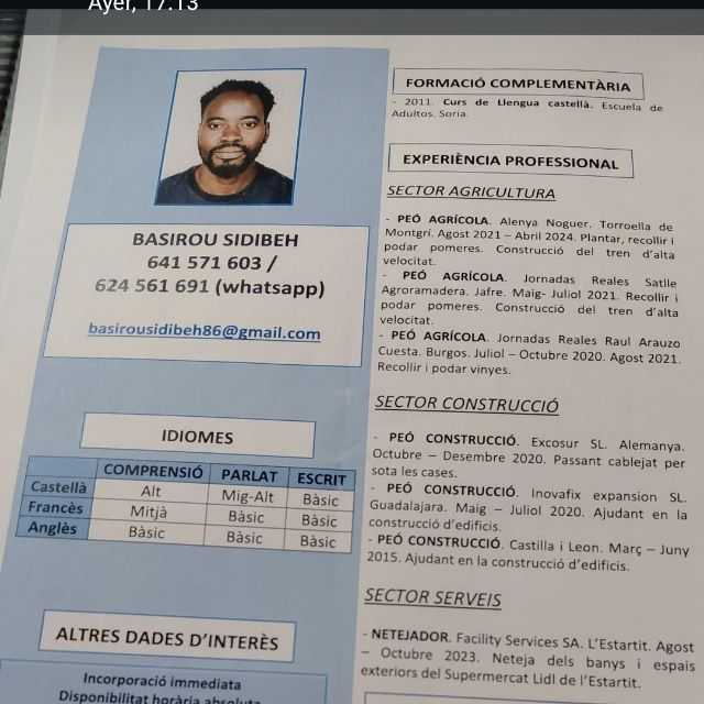Persona íntegra, respectuosa i responsable, amb experiència al sector de l'alimentació i com a operari-repartidor.