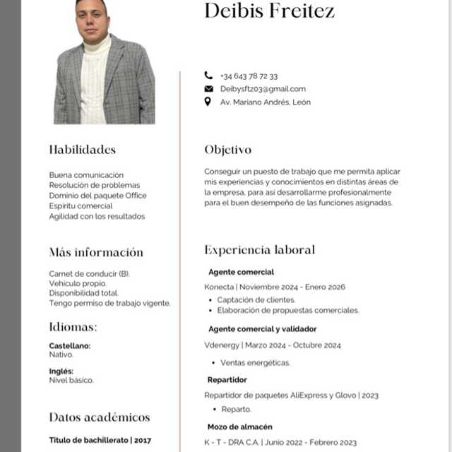 Soy comercial de ventas he trabajado y sigo como promotor de ventas de luz y gas en Repso, gestiónde luz y gas. Camarero como trabajode verano. Trabaje en adeco como vendedor telefónico de segurosdel hogar.