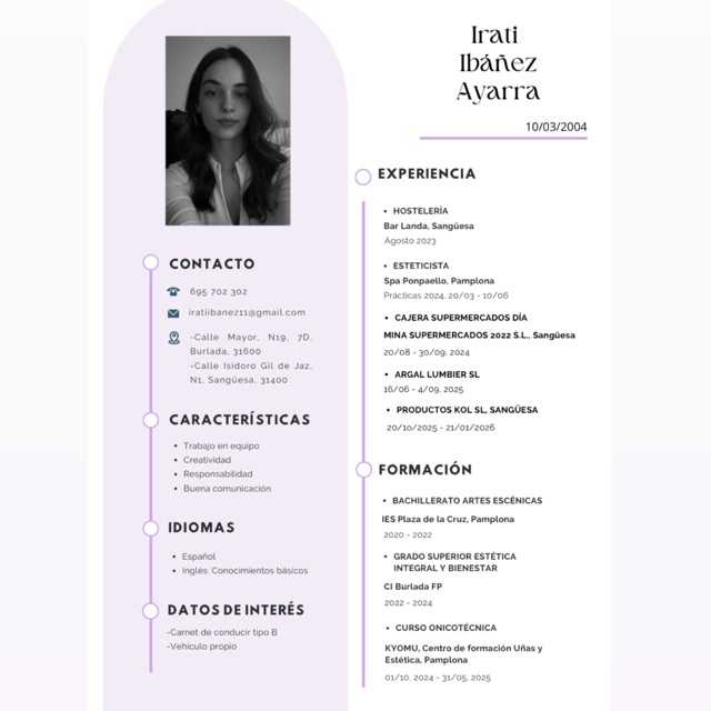 Joven de 24 años de pamplona. Experiencia demostrable como manicurista y monitora de ocio y tiempo libre. Me gusta mantener el area de trabajo limpia y organizada. Buena respuesta ante situaciones laborales de mucha presión.