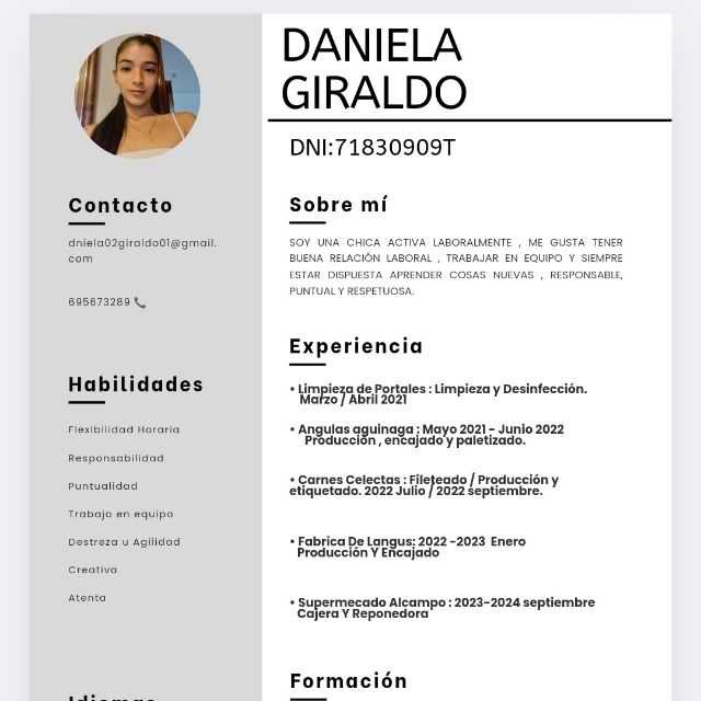 Soy una persona responsable, comprometida y con gran motivación para aprender y crecer profesionalmente. Me adapto con rapidez, disfruto del trabajo en equipo y aporto una actitud positiva.