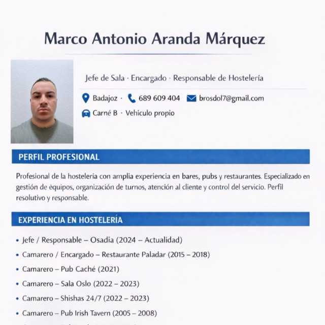 Soy camarero y técnico en telecomunicaciones, con experiencia en captación de clientes, servicios de catering, dinámico y con buena comprensión.