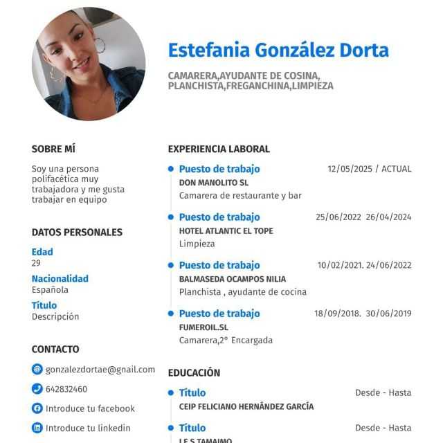 Experiencia y conocimiento en el sector de la hostelería como camarera, barra y atención al cliente. Me agrada mucho el trato con las personas, soy rápida, y el trabajo bajo presión. Tengo experiencia con atención al cliente y recepción