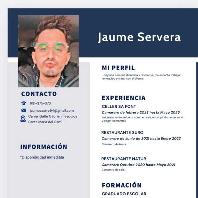 Profesional de la hostelería con experiencia en sala y atención al cliente. Trato cercano, liderazgo y conocimiento de vinos, maridajes y gastronomía.