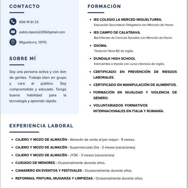 Joven ambicioso con dotes en ventas. Simpático y sociable con buena experiencia en trabajos en equipo Disponibilidad completa tanto turnos de mañana o tardes como fines de semana y festivos.