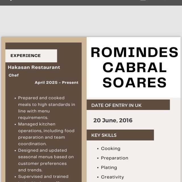I work 2016 and 2018 work India restaurant and tiffin tandoori oxford chef 2018 and 2021 l work restorant company hakasan restaurant Chinese food chef 2021 and 2024 work Busaba restaurant and l,m chaff cookie for customer and chef…..
